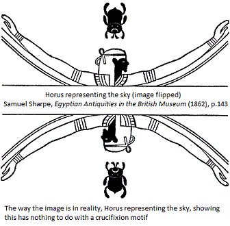 Occasionally you might see the claim that there were many uses of crucifixion/crucifixes and the cross in pre-Christian religions. Some of the examples are pure fantasy. For example, some point to many ancient statuettes, whose outstretched arms (cruciforms) are misused to say these were used as crucifixes. This is obviously absurd and a cruciform is not a depiction of or anything related to crucifixion. The modern term, cruciform, comes from the similarity of crucifixion, not because they actually represent crucifixions. Proof of this is the fact that any pre-Persian statues/art of cruciform predates crucifixion, which was invented around 500 BC, and popularized on a cross by the Romans, centuries later. So when someone throws an Egyptian hieroglyph of Horus with outstretched arms, this isn't Horus being crucified, but representing the vault of heaven. Osiris' outstretched arms are because he is holding the Sun, and has no relation to crucifixion (which didn't exist at the time).