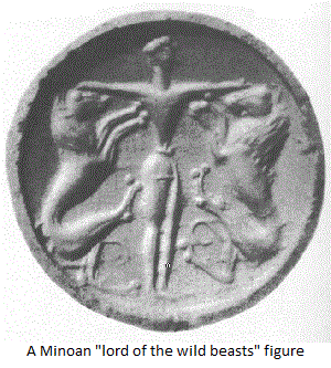 As for the second image below, it is a Minoan figure with two lions on the side. This is no more a parallel than the Bulgarian coat of arms on its right, which by the way, has a much better claim to being influenced by ancient pagan religions in this case than Christianity: