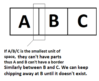 This non-constructive proof can't be avoided by saying space-time might be discreet as in loop quantum gravity. This is because if we take the three smallest units of space - A, B, and C - and put them next to each other, where is the border between A and B? Since these are the smallest units of space, there can be no border between A and B. Same for B and C. Thus B doesn't exist (at least without convergence - Paradox of Concentric Circles)!